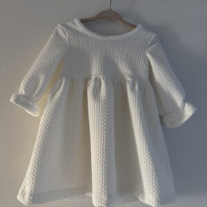 Laat je kleintje stralen in deze prachtige Witte Winterjurk, speciaal ontworpen voor de koudere dagen. Gemaakt van een zachte, gewatteerde stof met een stijlvol kabelpatroon, voelt deze jurk aan als een warme knuffel – én ziet er ook nog eens geweldig uit.