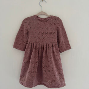 Deze prachtige jurk van broderie jersey is een perfecte mix van stijl en comfort. De zachte, rekbare stof voelt heerlijk aan op de huid en is luchtig dankzij de subtiele gaatjes in het patroon. Het model heeft lange mouwen en valt tot aan de enkels, wat een elegante en rustige uitstraling geeft.